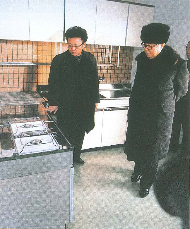 Kim Ir Sen a Kim Čong Il si prohlížejí byt na ulici Čchanggwang. Prosinec 1982.