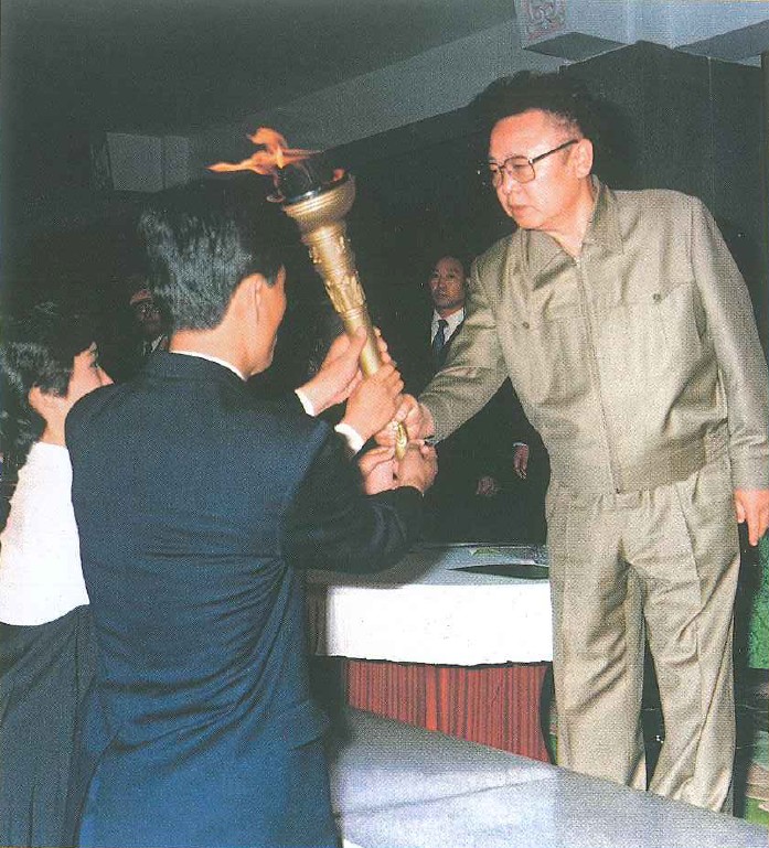 Kim Čong Il předává pochodeň průvodu mládeže a studentů Pchjongjangu. Říjen 1995.