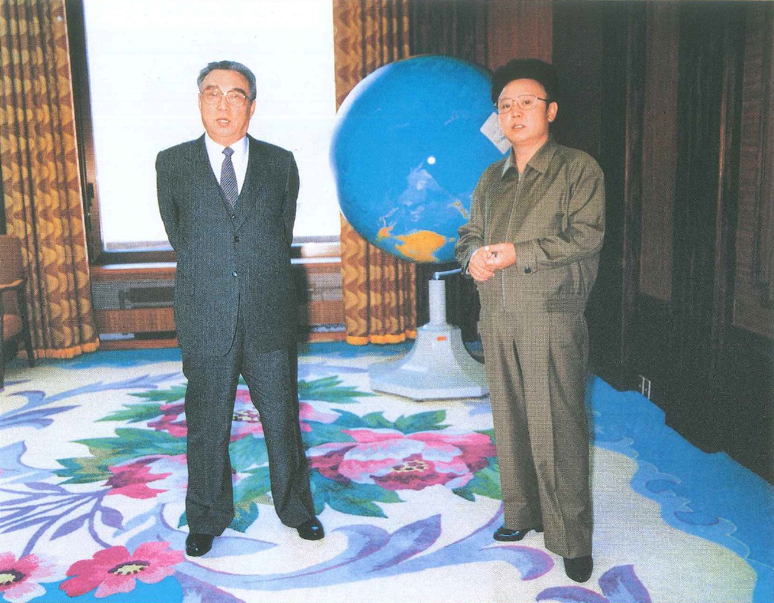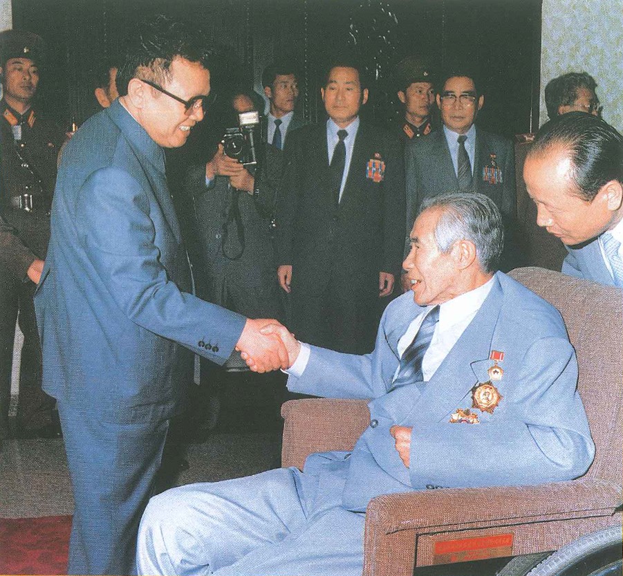 Kim Čong Il s Ri In Mo, ztělesněním víry a vůle. Vlastenecký mučedník Ri In Mo byl 41 let zadržován v jižní Koreji, z toho 34 let ve vězení. Červenec 1993.