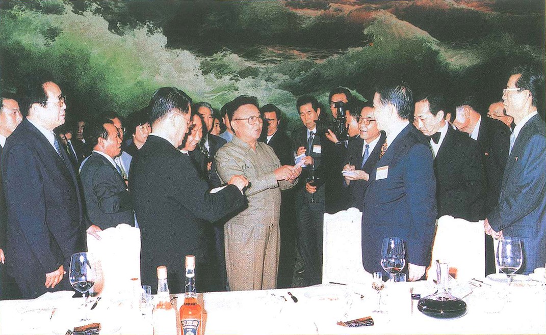 Kim Čong Il s delegací jihokorejských novinářů. Srpen 2000.