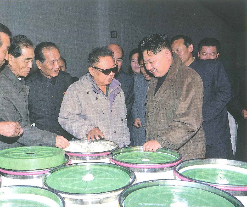 Kim Čong Il a Kim Čong Un na návštěvě „Vinalonového komplexu 8. února“. Říjen 2011.