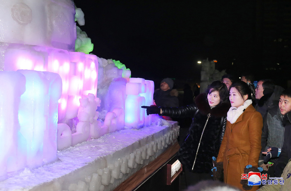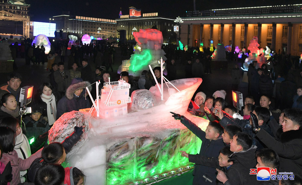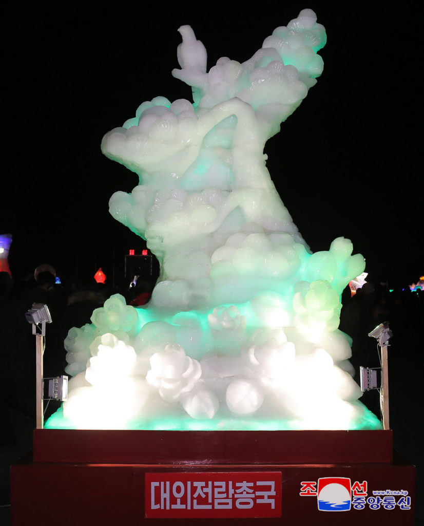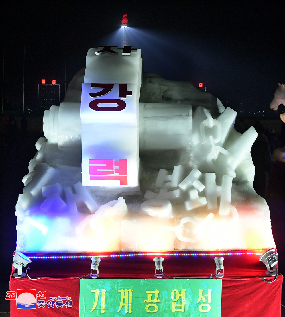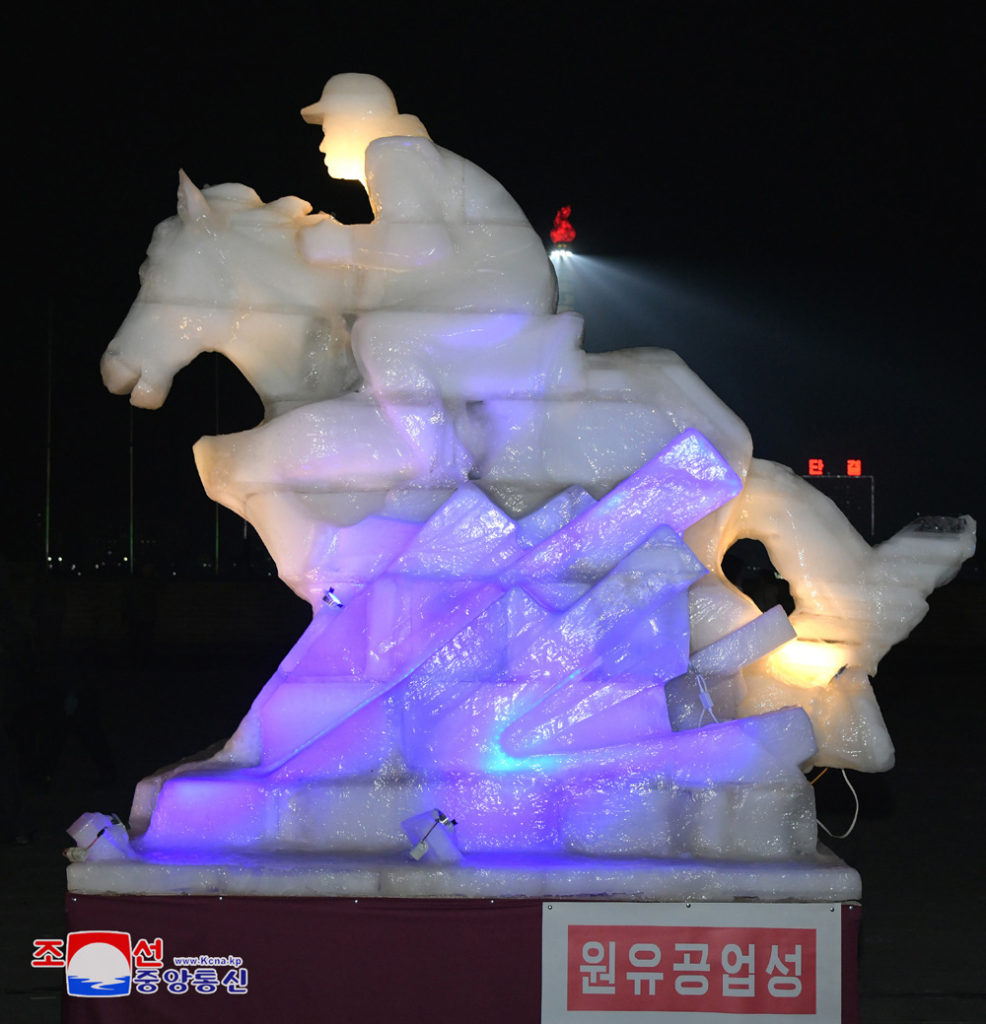 Ľadové sochy zobrazujúce rodisko veľkého vodcu súdruha Kim Ir Sena v Mangjongde, miesto narodenia veľkého vodcu súdruha Kim Čong Ila v tajnom tábore na hore Pektu a nesmrteľný kvet kimčongiliu, ukazujúc bezhraničnú úctu a ušľachtilú oddanosť kórejského ľudu súdruhom Kim Ir Senovi a Kim Čong Ilovi.