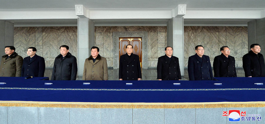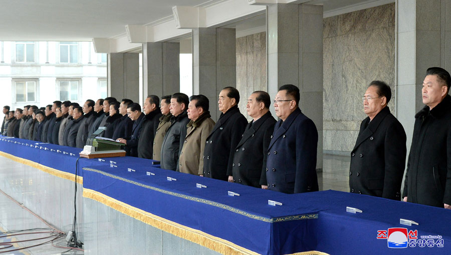 Na tribuně stál soudruh Pak Pong Ču, člen prezídia politického byra Ústředního výboru Korejské strany práce, místopředseda Komise pro státní záležitosti KLDR a předseda vlády KLDR; vysocí funkcionáři strany a vlády soudruzi O Su Jong, An Čong Su, Ro Tu Čchol, Čche Hwi a Pak Tche Dok, místopředsedové vlády, funkcionáři strany a mocenských orgánů, průmyslových podniků a jednotných zemědělských družstev v Pchjongjangu a zasloužilí pracovníci, pracující lid, mládež a studenti.