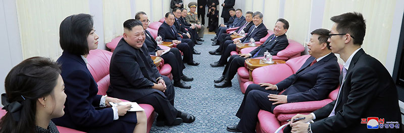 Váženého soudruha nejvyššího vůdce doprovázela jeho manželka Ri Sol Džu. Součástí jeho doprovodu byli soudruzi Ri Su Jong, Kim Jong Čhol, Pak Tche Song, členové politického byra a místopředsedové Ústředního výboru Korejské strany práce; soudruh Ri Jong Ho, člen politického byra ÚV KSP a ministr zahraničních věcí; soudruh No Kwang Čchol, kandidát politického byra ÚV KSP a ministr lidových ozbrojených sil; soudružka Kim Jo Čong, kandidátka politického byra a první zástupkyně vedoucího oddělení ÚV KSP; soudruzi Ri Il Hwan a Čche Tong Mjong, vedoucí oddělení ÚV KSP a další vedoucí funkcionáři ÚV KSP a Komise pro státní záležitosti KLDR.