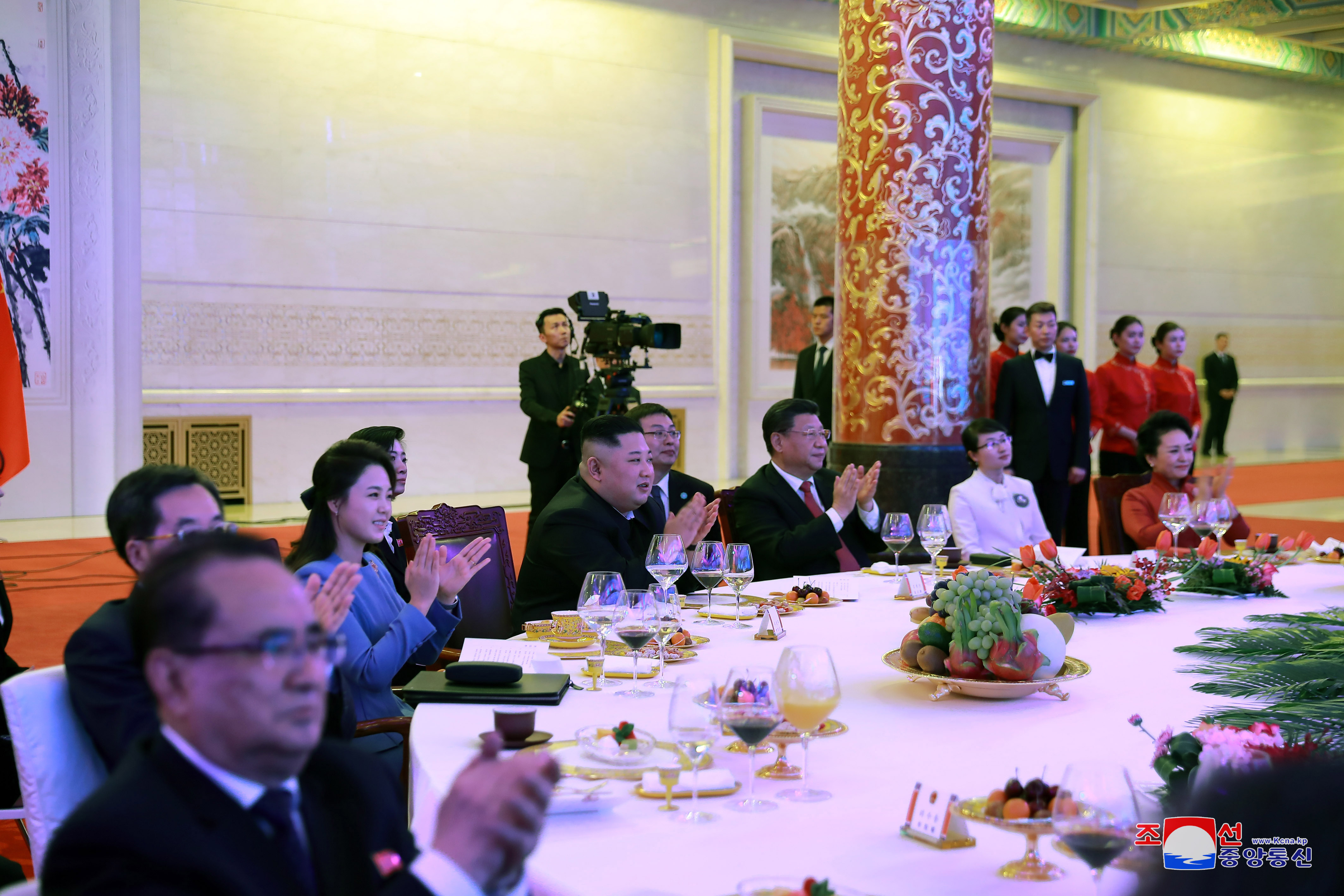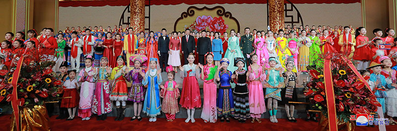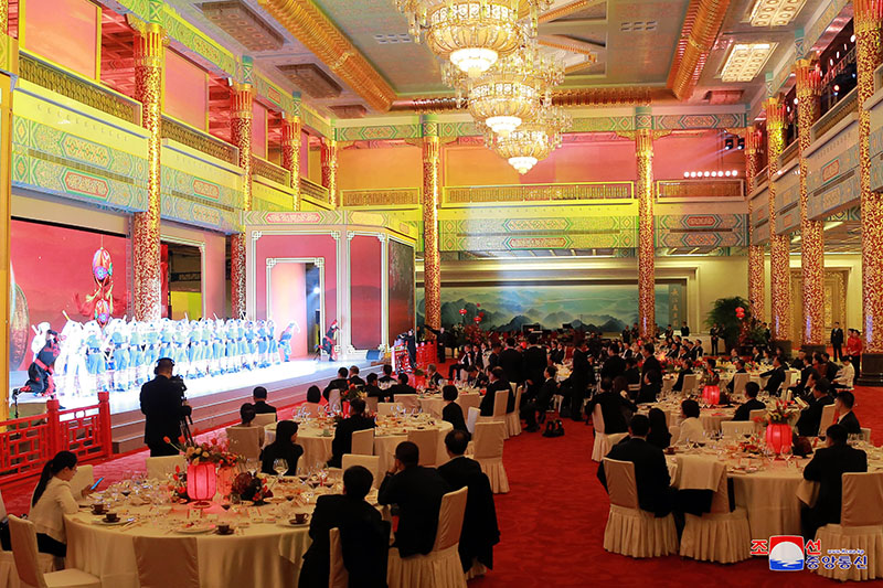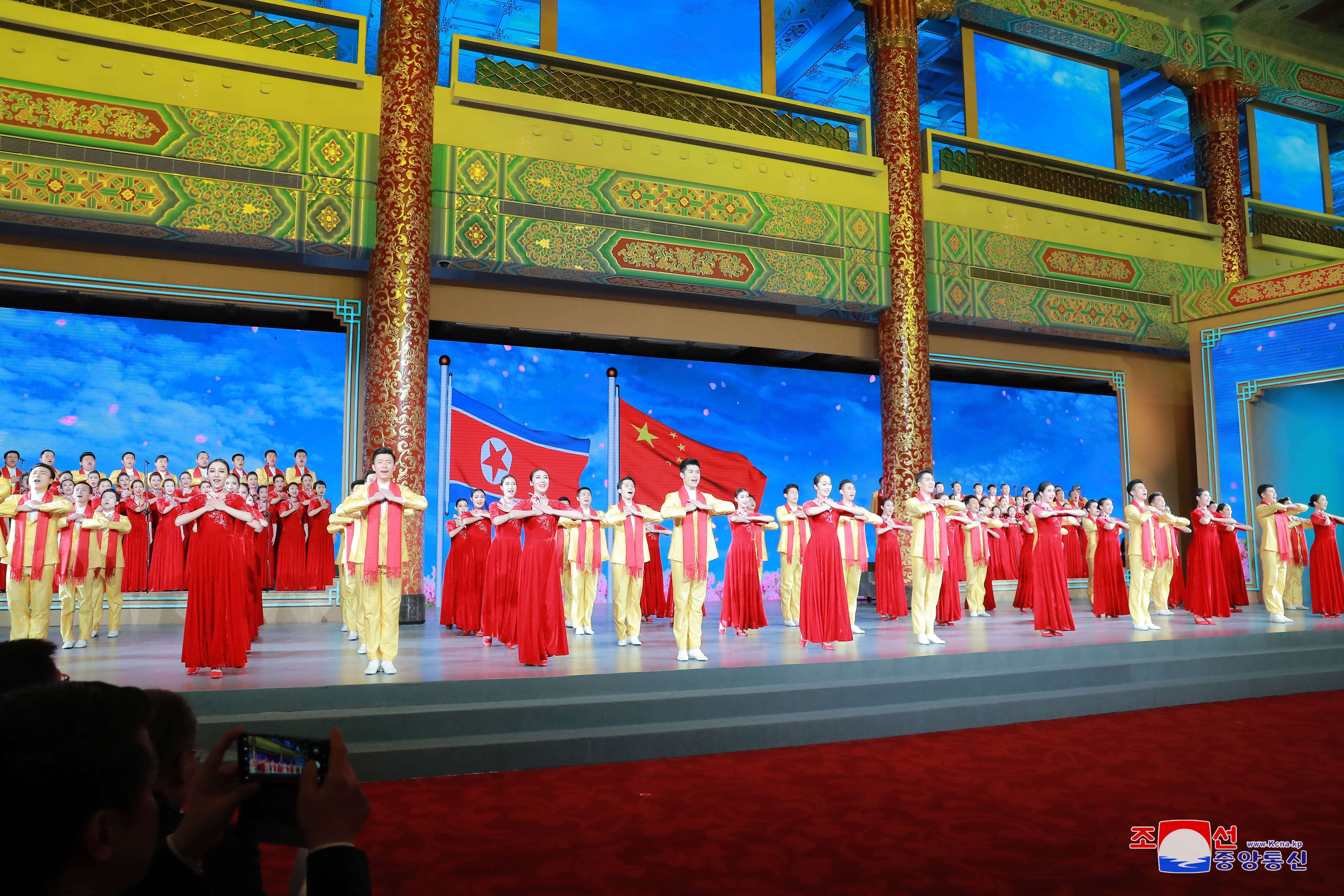 Na recepci uvedli čínští umělci mimořádné představení na počest historické návštěvy váženého soudruha nejvyššího vůdce v Číně. Vážený soudruh nejvyšší vůdce a první dáma státu Ri Sol Džu vystoupili na pódium se soudruhem Si Ťin-pchingem a jeho chotí Peng Liyuan, aby poděkovali umělcům a vyfotografovali se s nimi.