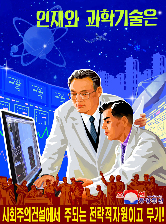 Další plakát „Talentované kádry, věda a technika jsou naše hlavní strategické zdroje a zbraně v socialistické výstavbě!“ odráží politiku strany upřednostňovat vědu a technologii a revoluční politiku vzdělávání.
