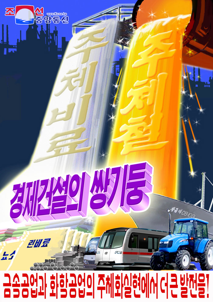 Plakáty „Podněcujme k dosažení cílů pětileté strategie národního hospodářského rozvoje!“ a „Dosáhněme většího rozvoje v ustavování orientace metalurgického a chemického průmyslu na čučche!“ vyzývají všechny sektory a jednotky k úspěšnému splnění cílů letošního boje uskutečněním velkého revolučního vzestupu.