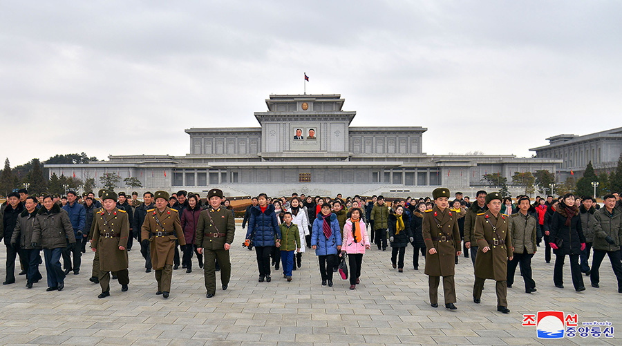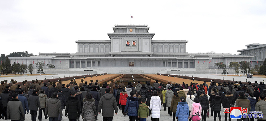 Masy vstoupily na náměstí Paláce slunce Kumsusan, posvátného chrámu čučche, kde leží v rakvích ve své životní podobě velký vůdce soudruh Kim Ir Sen a velký vůdce soudruh Kim Čong Il, a poklonily se portrétům slunečně usměvavých soudruhů Kim Ir Sena a Kim Čong Ila.