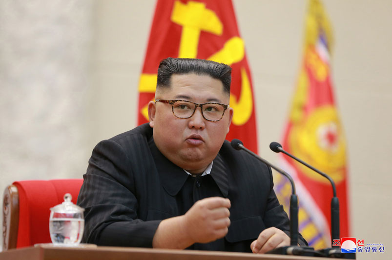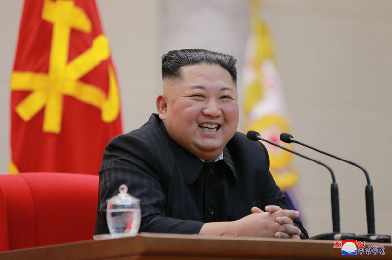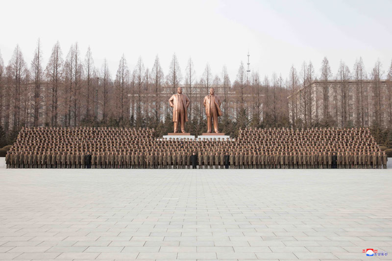 Vážený soudruh nejvyšší vůdce se nechal na paměť vyfotografovat s velícími důstojníky KLA před bronzovými sochami velkého vůdce soudruha Kim Ir Sena a velkého vůdce soudruha Kim Čong Ila na Ministerstvu lidových ozbrojených sil.