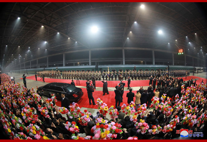 Keď vystúpil z vlaku, bol pozdravený od vedúceho čestnej stráže Kórejskej ľudovej armády.