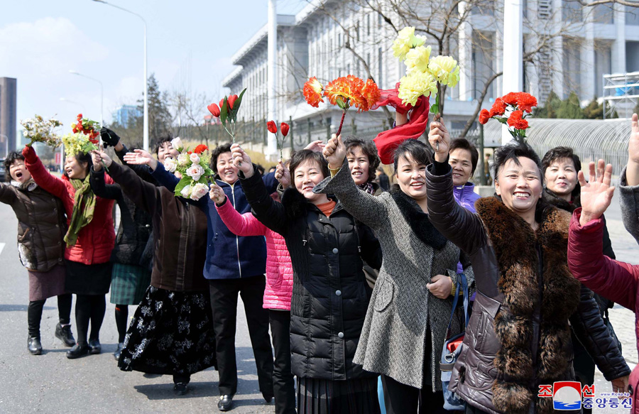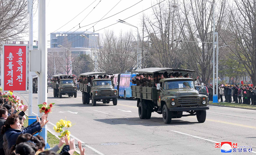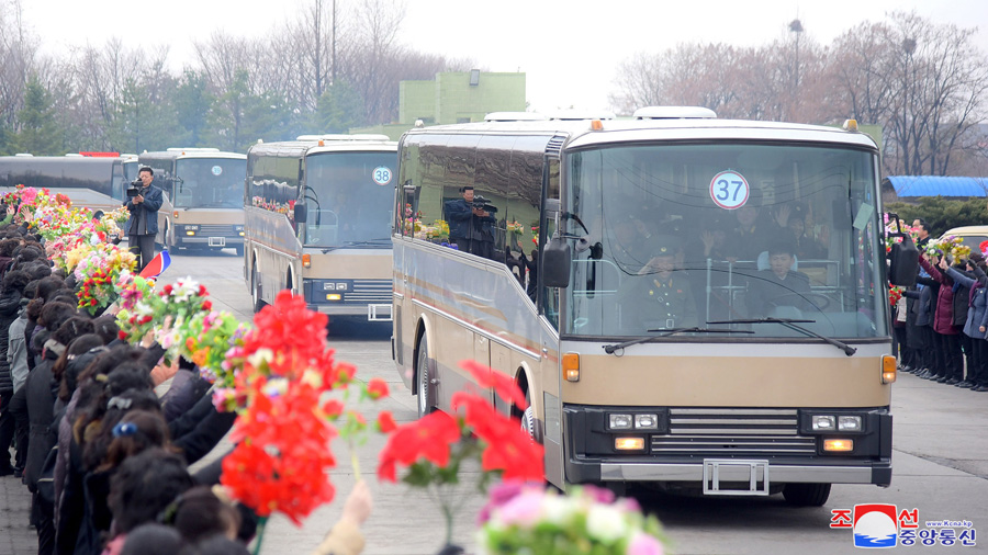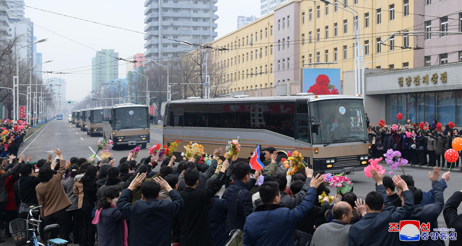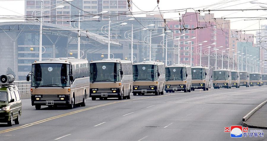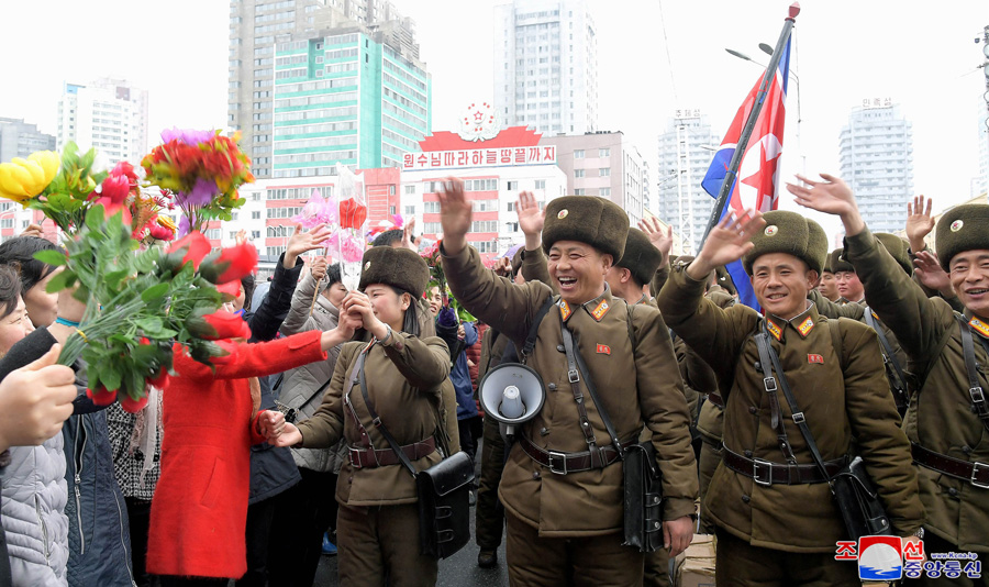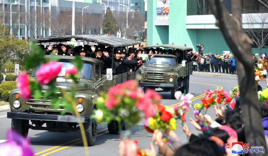 Pchjongjang, 1. dubna čučche 108 (2019) (KCNA) – Za srdečných gratulací obyvatel Pchjongjangu odjeli účastníci 5. shromáždění velitelů a politruků rot Korejské lidové armády na obranné základny země.