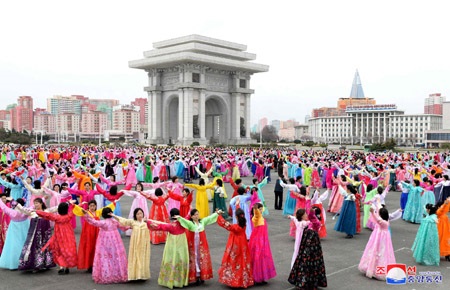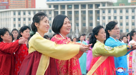 Pchjongjang, 9. apríla čučche 108 (2019) (KCNA) – Funkcionárky a členky Socialistického zväzu žien usporiadali v utorok na Námestí Víťazného oblúka tanečné oslavy pri príležitosti 26. výročia zvolenia veľkého generála súdruha Kim Čong Ila za predsedu Komisie národnej obrany Kórejskej ľudovodemokratickej republiky.