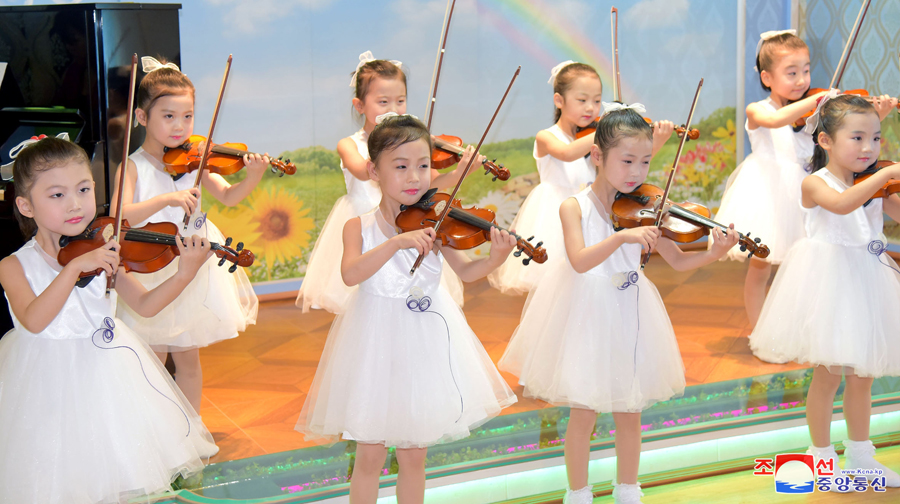 Ředitelka mateřské školy Kim Hjong E uvedla, že je to už 40 let od zřízení hudebních tříd pro housle a kajagum pod záštitou velkého vůdce soudruha Kim Čong Ila. Ten věnoval velkou pozornost práci pedagogů a daroval žákům různé hudební nástroje, akustickou techniku ​​a autobus.