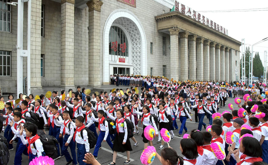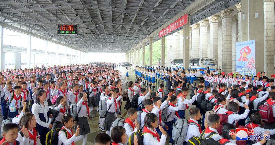 Příjezd účastníků oslav 73. výročí založení svazu dětí do Pchjongjangu