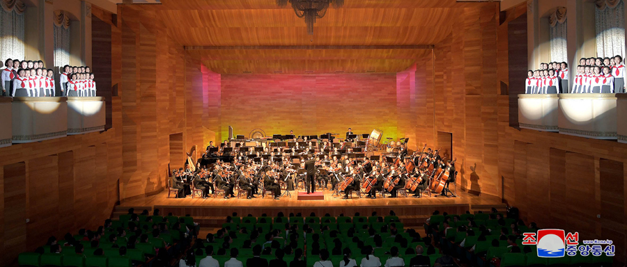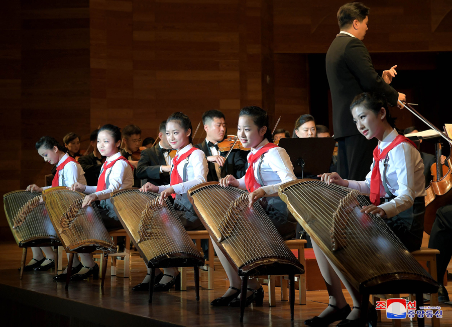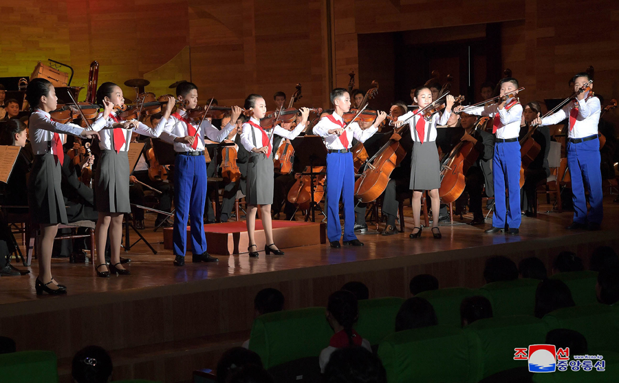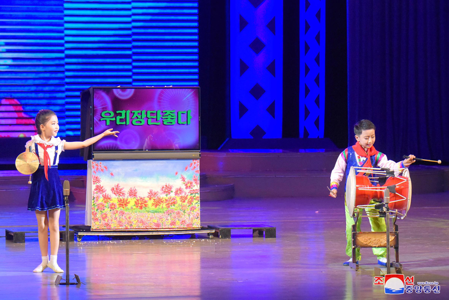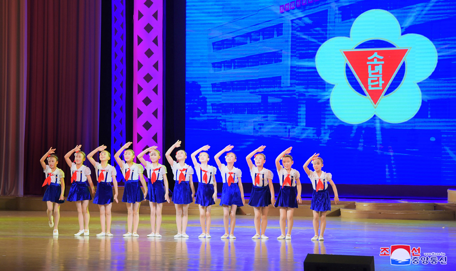 Umělecké představení „Tři milionů členů Korejského svazu dětí rostou pod vlajkou KLDR“ v Paláci školáků Mangjongde