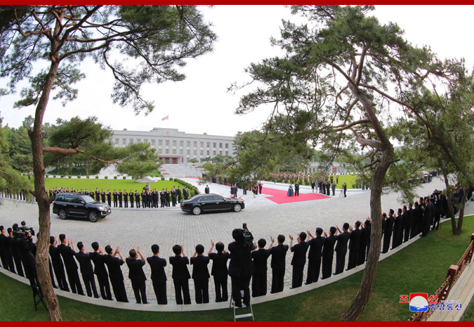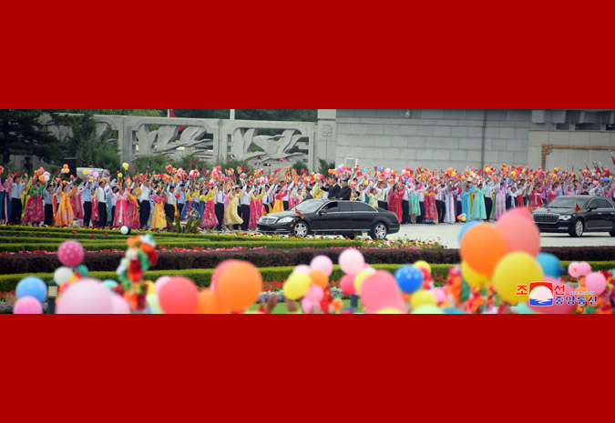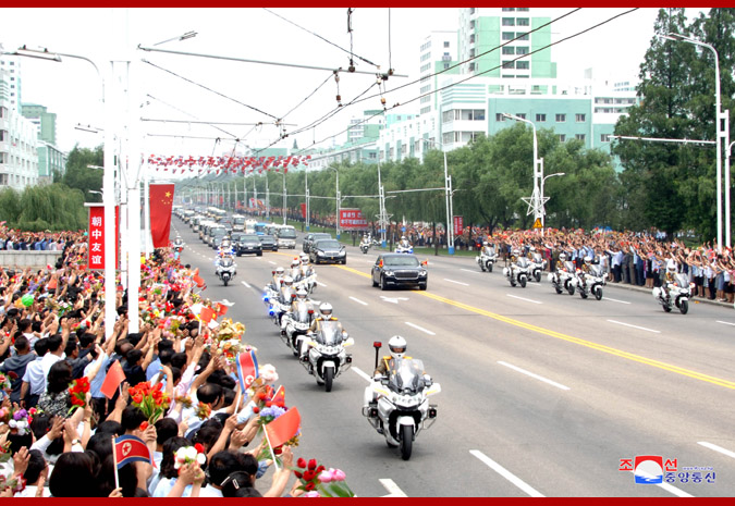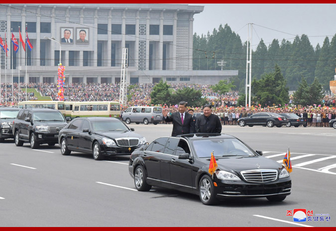 Automobil s najvyššími vodcami Kórejskej ľudovodemokratickej republiky a Čínskej ľudovej republiky opustil nádvorie Paláca slnka Kumsusan uprostred vrelého jasotu občanov mávajúcich vlajkami oboch krajín a kyticami kvetov, a zamieril do Rezidencie pre čestných hostí Kumsusan.