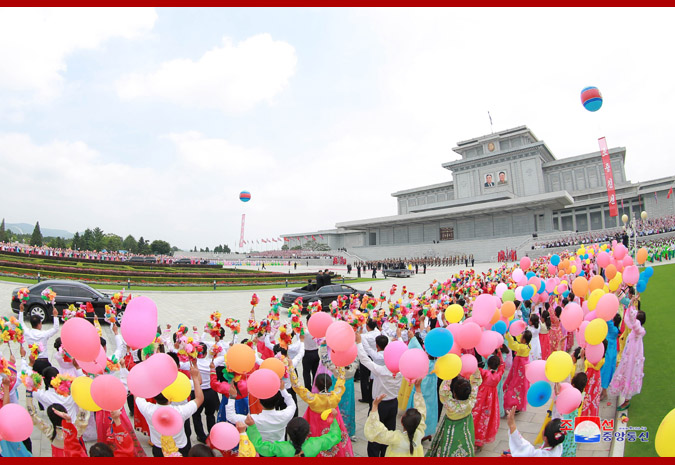 Otvorená limuzína, vezúca najvyšších vodcov KĽDR a Číny, dorazila prechádzajúc ulicu Rjomjong na nádvorie Paláca slnka Kumsusan, ktoré bolo preplnené vítajúcimi občanmi.