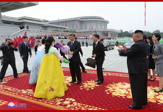 Najvyšší vodca vrelo privítal čínskeho prezidenta a jeho manželku, ktorí prišla s vľúdnymi priateľskými pocitmi čínskeho ľudu na pozvanie Ústredného výboru KSP, vlády KĽDR, všetkých členov strany, celého ľudu KĽDR i jeho samotného.