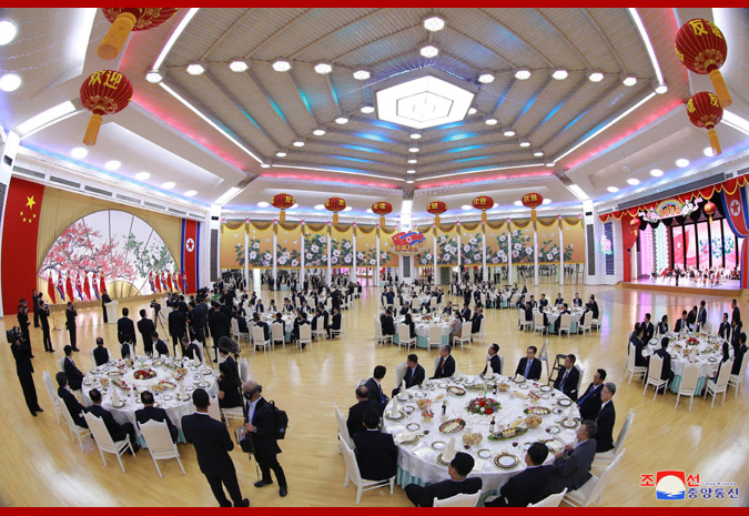 Večer sa uskutočnil na počesť návštevy súdruha Si Ťin-pchinga slávnostný banket. Vážený najvyšší vodca súdruh Kim Čong Un a jeho manželka s radosťou prijali prezidenta Si Ťin-pchinga a jeho manželku na mieste konania banketu.