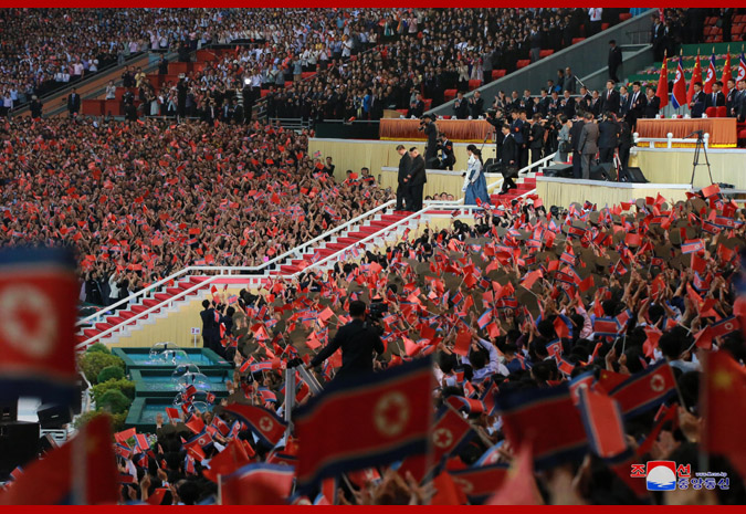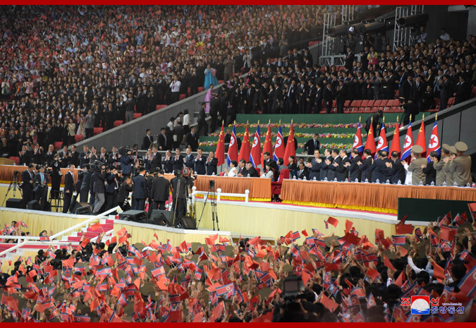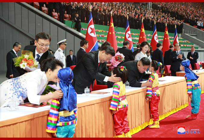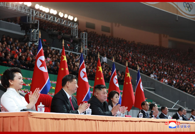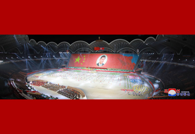 Večer si najvyšší predstavitelia KĽDR a Číny, súdruh Kim Čong Un a súdruh Si Ťin-pching, vychutnali veľké masové telocvičné a umelecké vystúpenie pod názvom „Nepremožiteľný socializmus.“