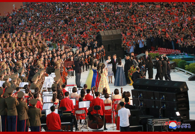 Súdruh Kim Čong Un a súdružka Ri Sol Džu spolu so súdruhom Si Ťin-pchingom a Peng Liyuan prišli na pódium, aby zablahoželali umelcom k ich úspešnému výkonu.