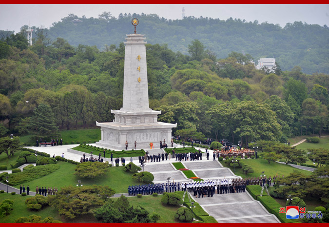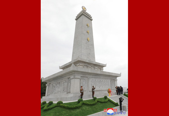 Súdruh Kim Čong Un a súdruh Si Ťin-pching spolu s ostatnými účastníkmi ticho vzdali hold pamiatke mučeníkov z radu dobrovoľníkov čínskeho ľudu.