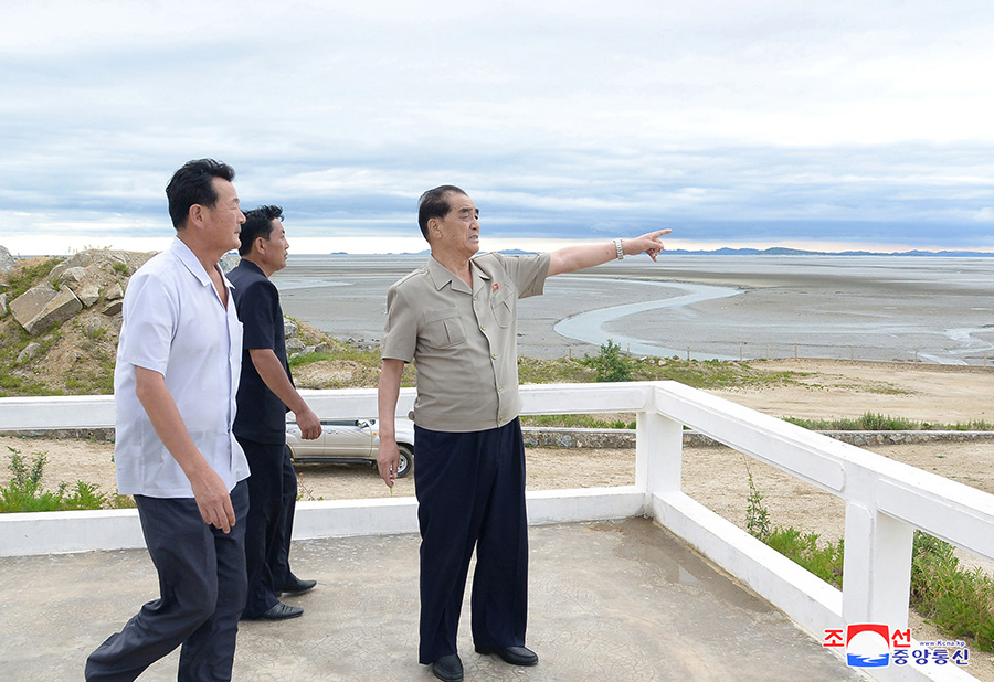 Pri pohľade na miesto rekultivácie prílivovej oblasti Rjongmedo, sa porozprával so staviteľmi, ktorí pracujú na výstavbe protiprílivovej hrádze a zdôraznil potrebu ďalej zlepšovať dodávky materiálov a pokračovať vo výstavbe.