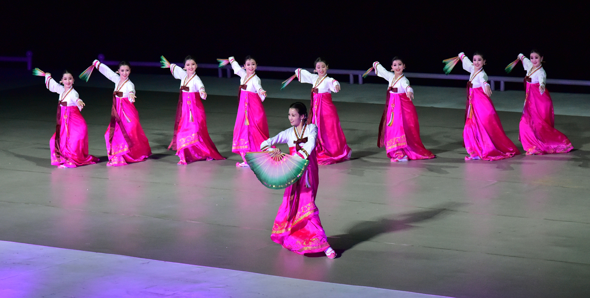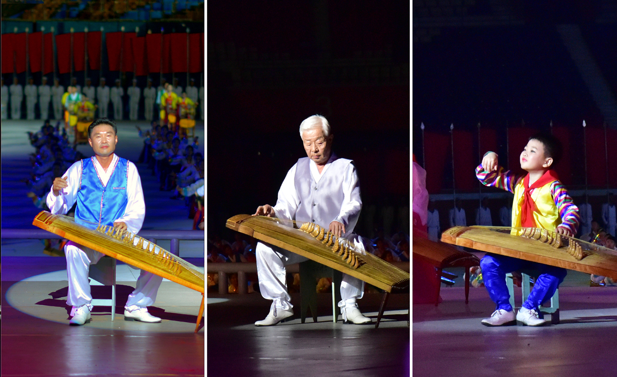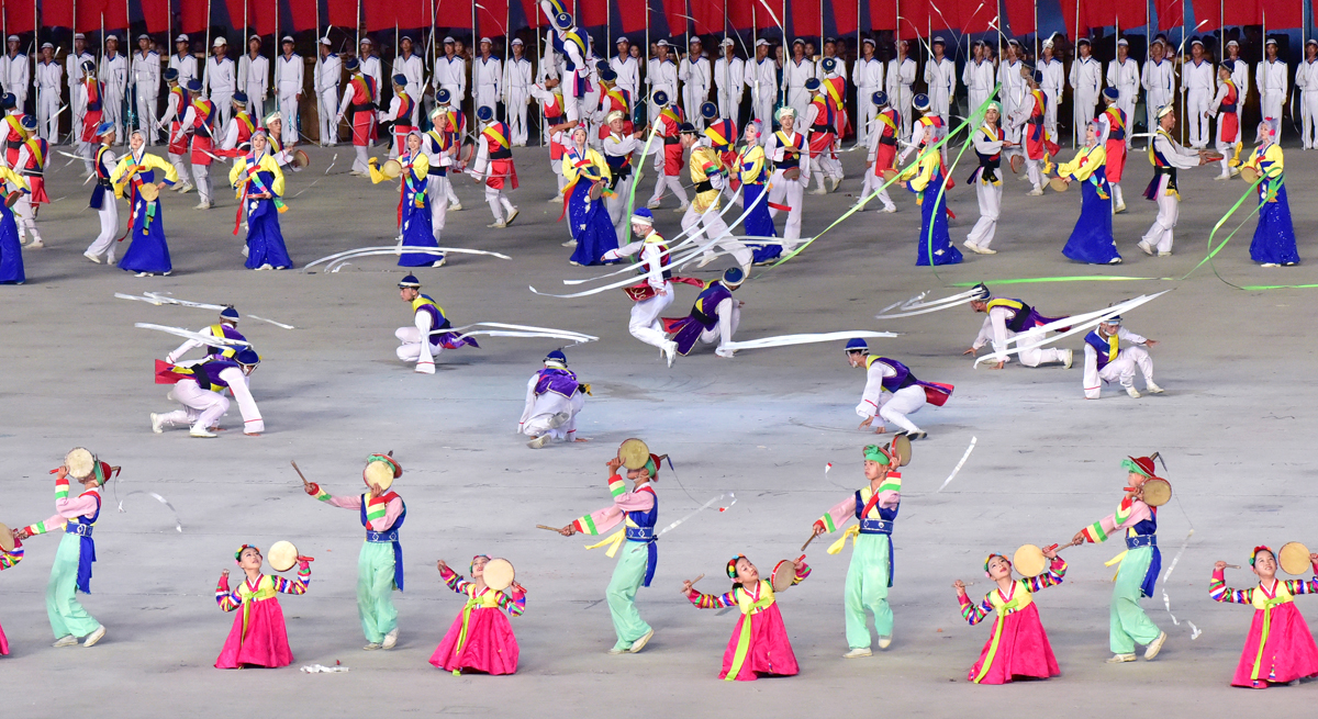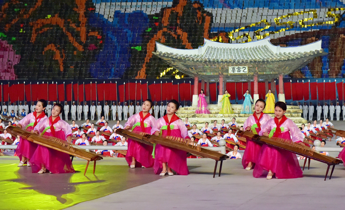 Velkoformátové scény provádí více než 17 tisíc studentů středních škol v Pchjongjangu. Více než tisíc hudebníků ve věku od 8 do 70 let hraje na jevišti na kajagum (korejský lidový strunný nástroj, pozn. překl.).