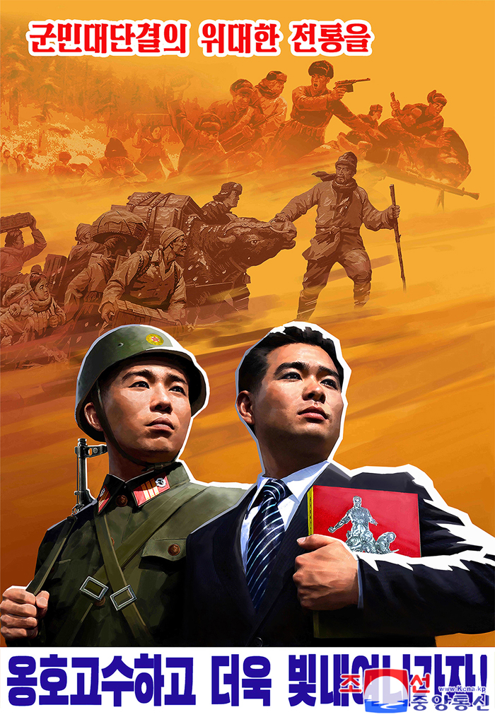 Plakát „Chraňme a dodejme lesk velké tradici velké jednoty armády a lidu!“ vyzývá k prokázání statečného ducha čučchejské Koreje díky velké jednotě armády a lidu, hrdé tradici korejské revoluce, silné záruce obrany země a revoluce a mocné hnací síle pro budování mocné socialistické země.