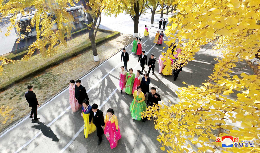 Pchjongjang, 3. listopadu čučche 108 (2019) (KCNA) – Lidé jsou potěšeni atraktivní podzimní krajinou ulice Čchollima.
