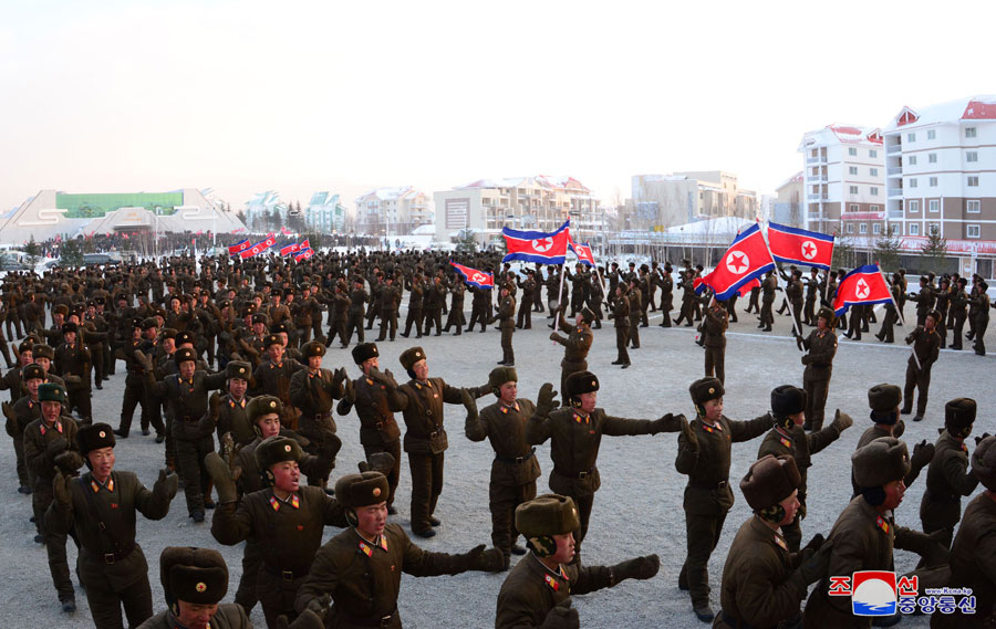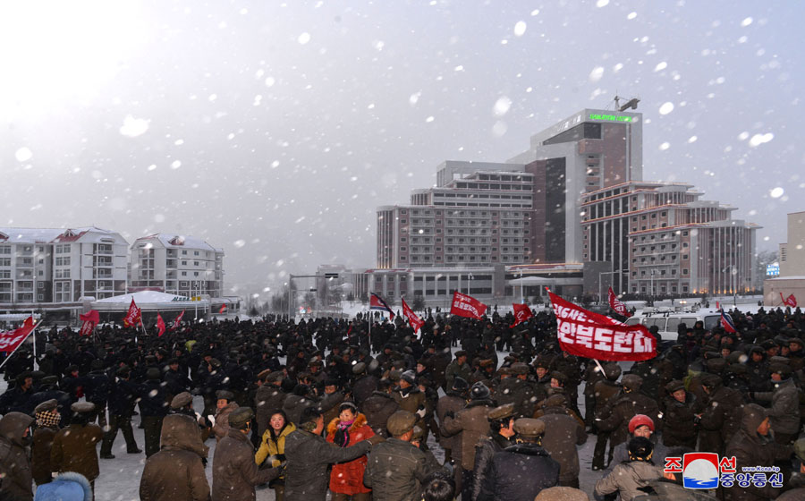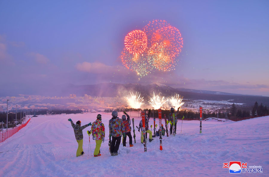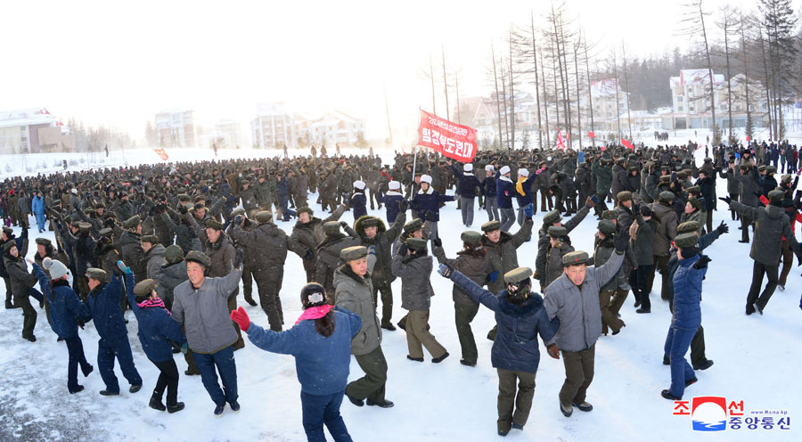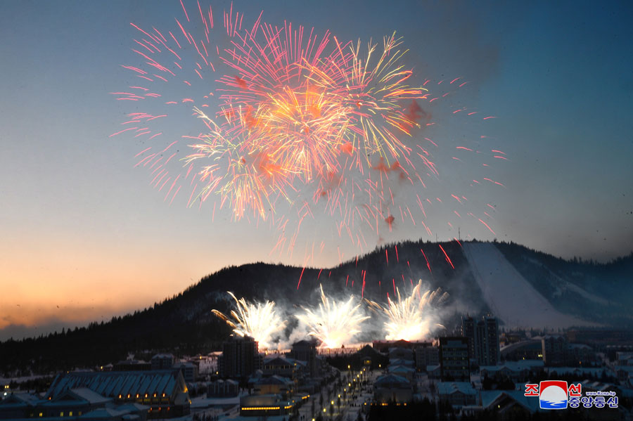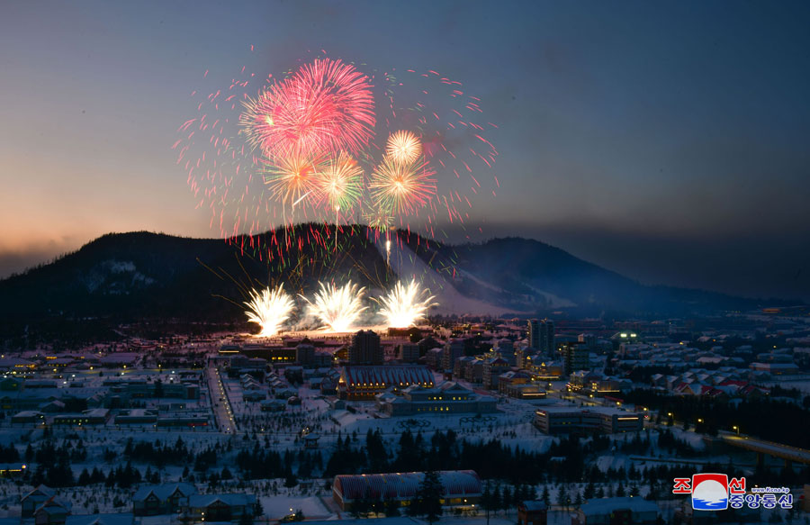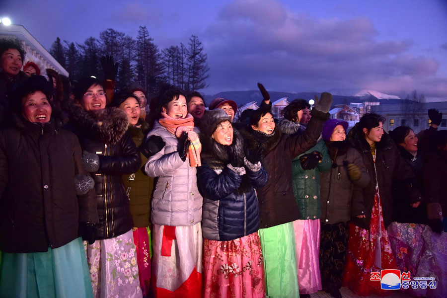 Pchjongjang, 3. prosince čučche 108 (2019) (KCNA) – 2. prosince se konaly taneční oslavy a ohňostroje na oslavu dokončení výstavby centra okresu Samdžijon.
