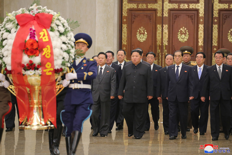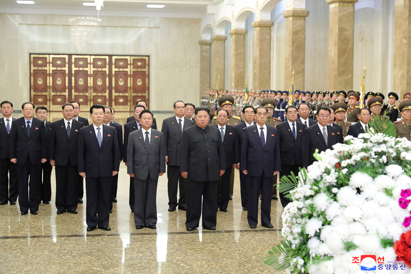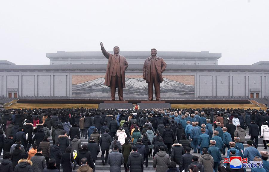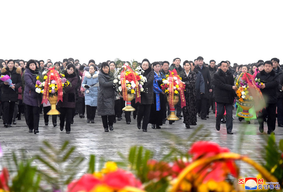 Vážený nejvyšší vůdce soudruh Kim Čong Un vstoupil do sálu, kde se tyčí sochy velkéhpo vůdce soudruha Kim Ir Sena a velkého vůdce soudruha Kim Čong Ila. Před sochy byl položen květinový koš jménem váženého soudruha nejvyššího vůdce. Poté vážený soudruh nejvyšší vůdce navštívil sál nesmrtelnosti, kde leží soudruh Kim Čong Il ve své životní podobě, a poklonou vyjádřil hlubokou úctu velkému generálovi, který nezištně sloužil vlasti a lidu až do poslední doby svého revolučního života a vykonal vše pro následnictví a dovršení revoluční věci čučche a rozkvět budoucích generací.