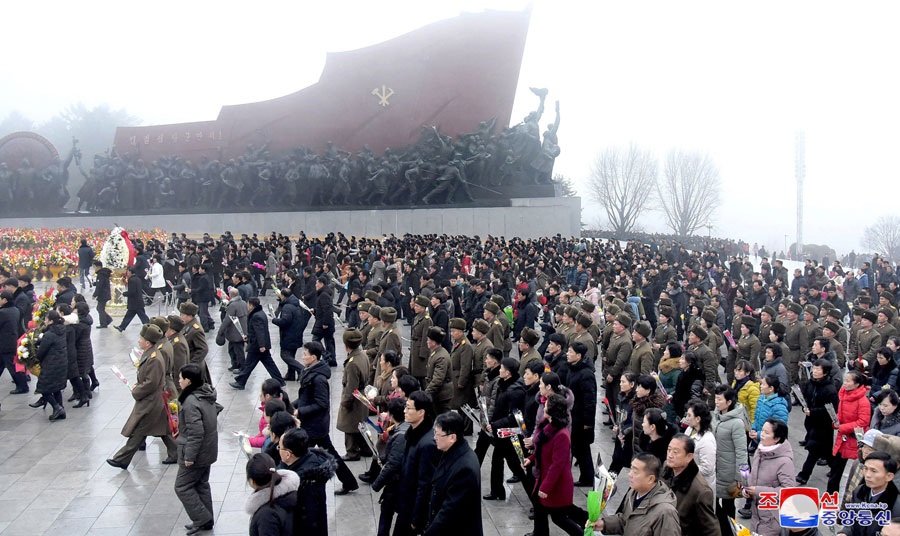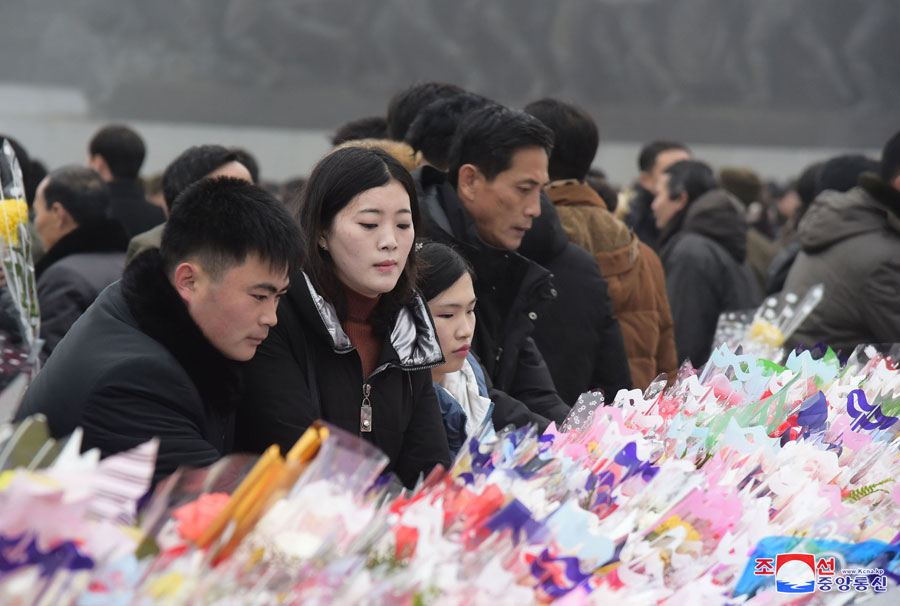 U příležitosti největšího národního smutku lid a sloužící mužstvo navštívili Palác slunce Kumsusan, posvátný chrám čučche, kde leží velký vůdce soudruh Kim Ir Sen a velký vůdce soudruh Kim Čong Il v životní podobě, a vzdali jim hold.