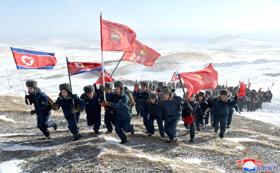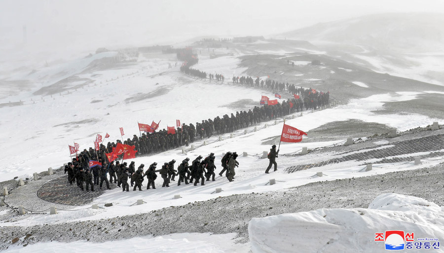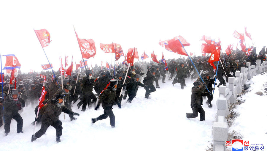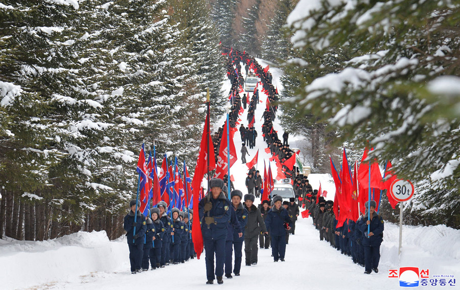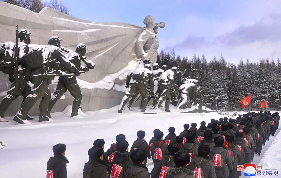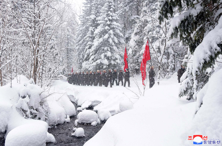 Pchjongjang, 8. ledna čučche 109 (2020) (KCNA) – Následuje vynikajícího velkého velitele, který se vydal na koni do posvátné oblasti Pektusanu, nekonečný proud lidu se účastní studijní cesty po místech revoluční a bojové slávy v oblasti hory Pektu (Pektusan) za zpěvu písně „Půjdeme na horu Pektu“.