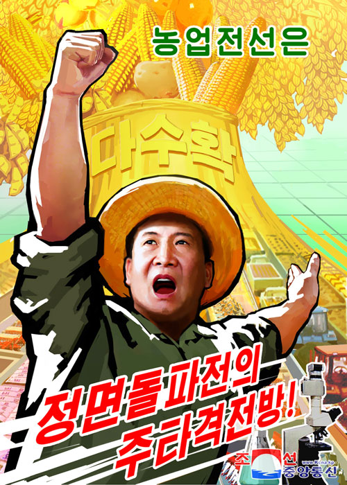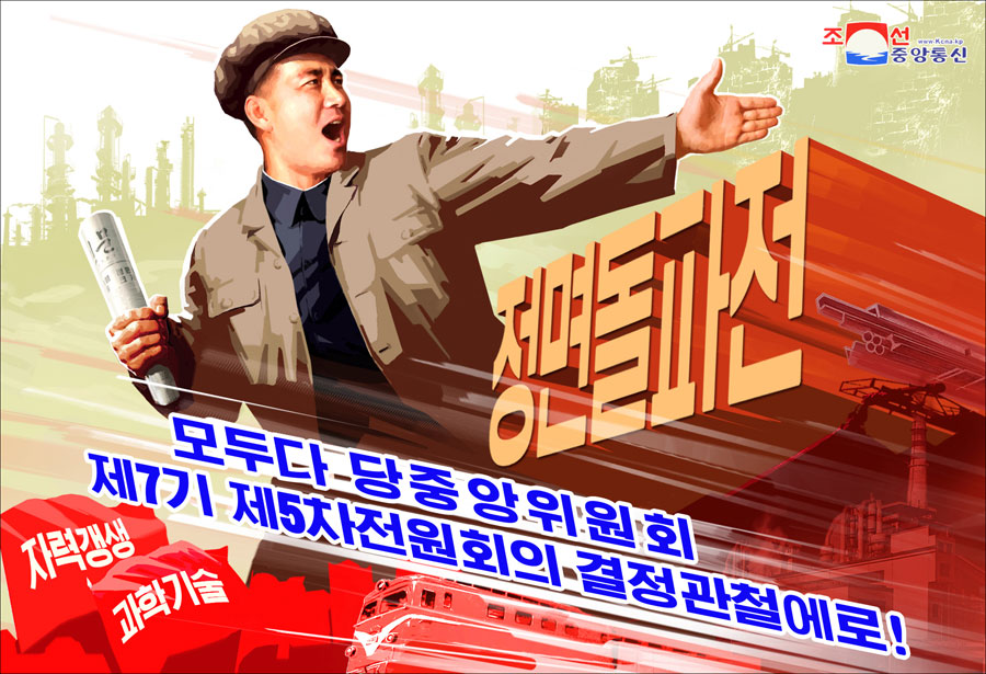 Plakáty „Proveďme rozhodnutí 5. plenárního zasedání 7. Ústředního výboru strany!“ a „Překonejme všechny překážky našeho pokroku!“ odrážejí myšlenku povstat jako jeden muž k frontálnímu průlomu se vztyčeným praporem dosažení rozkvětu pomocí soběstačnosti, semknuti kolem váženého nejvyššího vůdce soudruha Kim Čong Una.
