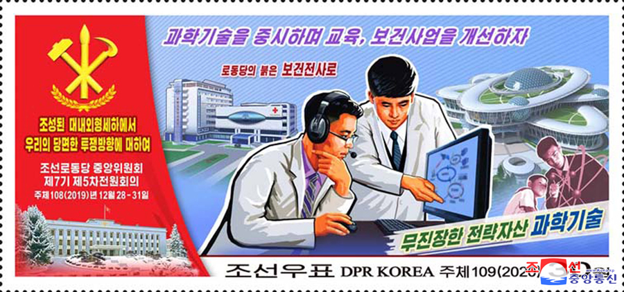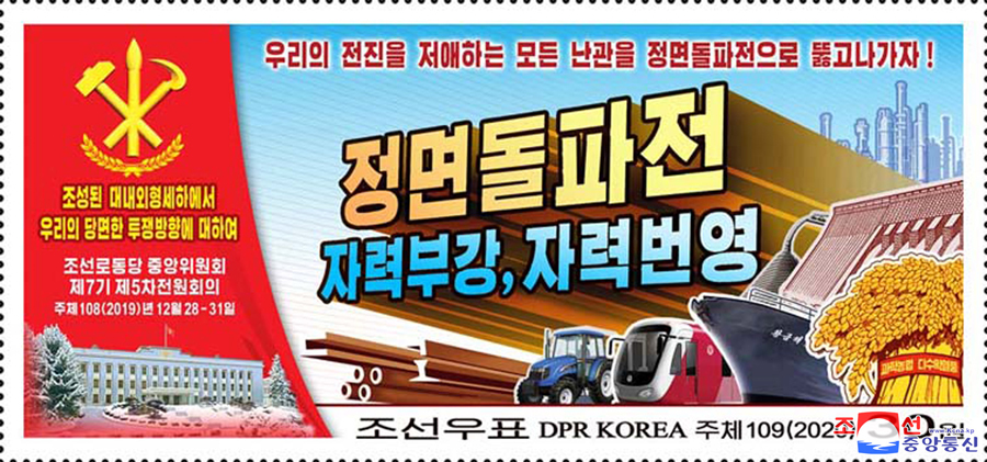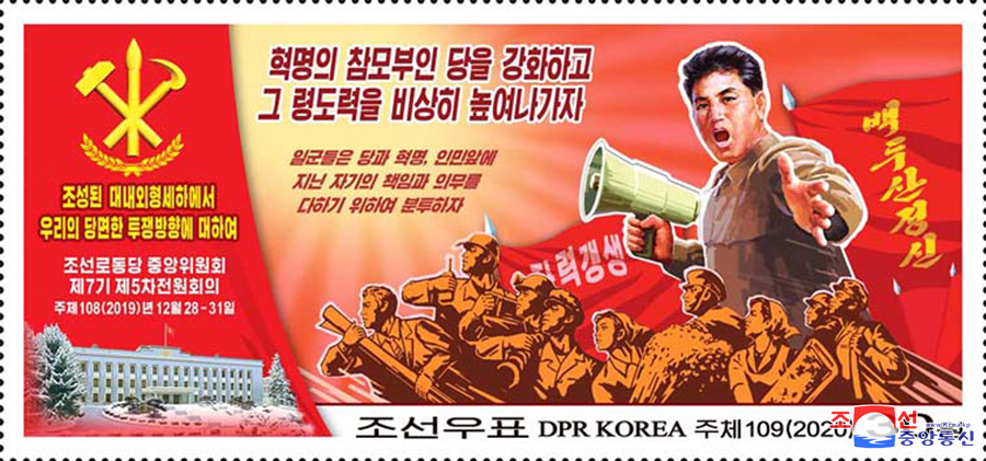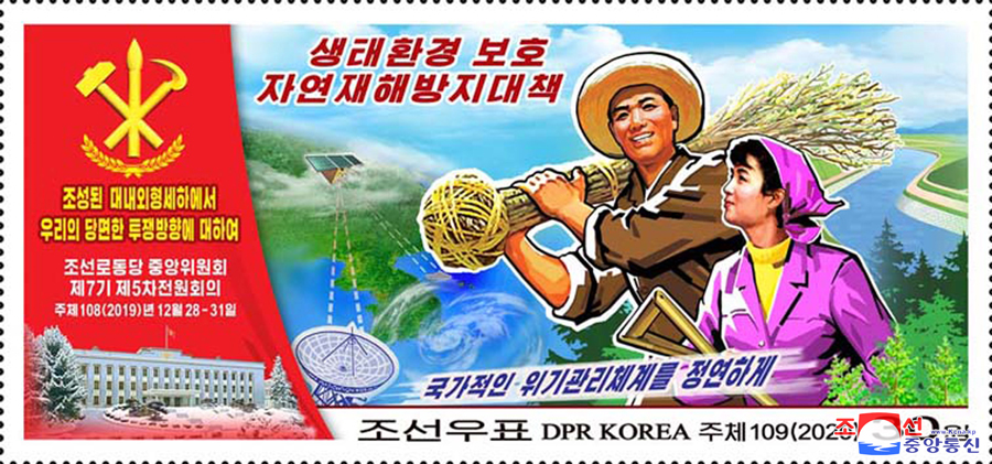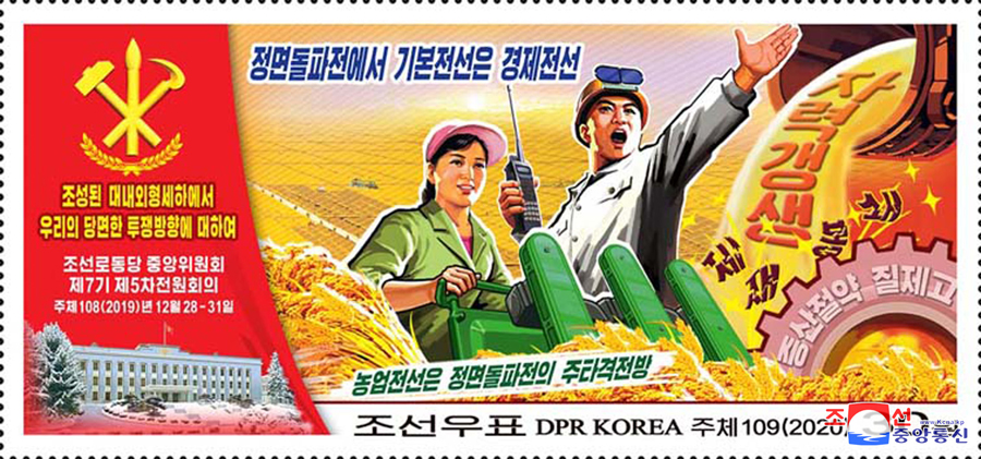 Pchjongjang, 9. února čučche 109 (2020) (KCNA) – Státní známkový výbor Korejské lidově demokratické republiky vytvořil a vydal nové poštovní známky (pět jednotlivých), odrážející základní myšlenky a hlavního ducha 5. pléna 7. Ústředního výboru Korejské strany práce.