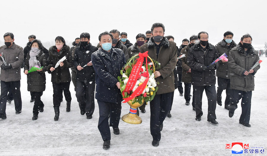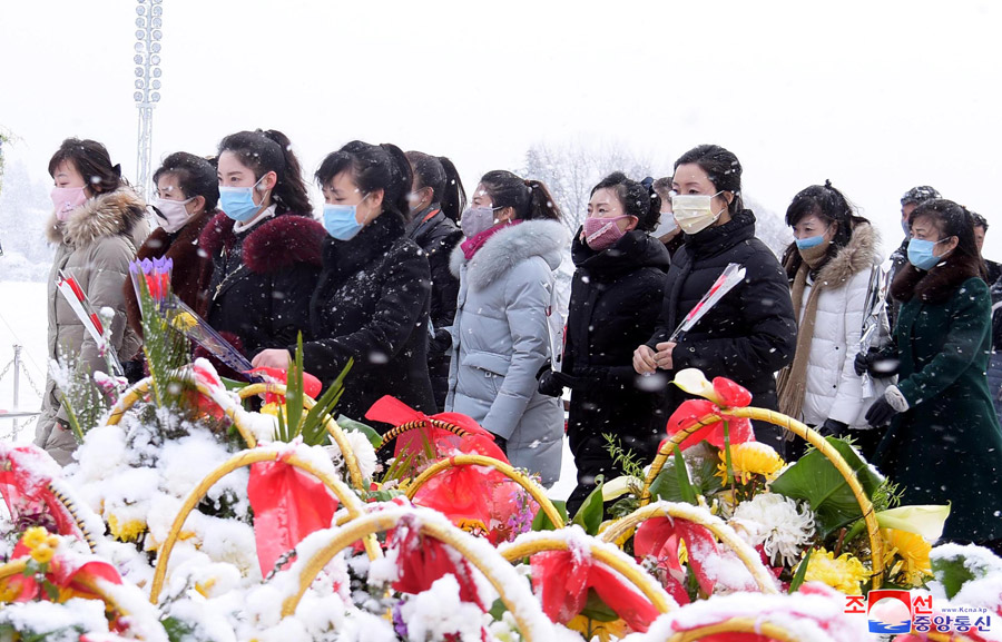 K sochám velkého vůdce a velkého generála byly položeny koše květin jménem stranických a vládních orgánů, orgánů ozbrojených sil, společenských organizací, ministerstev, ústředních institucí, jednotek Korejské lidové armády a Korejských lidových vnitřních bezpečnostních sil, institucí, továren a podniků všech úrovní města Pchjongjangu a dalších a rovněž za Pchjongjangou misi Antiimperialistické národní demokratické fronty.