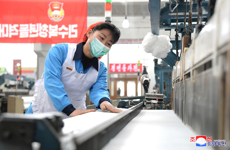 Pchjongjang, 20. února čučche 109 (2020) (KCNA) – Pracující Pchjongjangského textilního kombinátu Kim Čong Suk s nadšením kráčejí v předvoji v bitvě za frontální průlom a uskutečňují novátorství ve výrobě tkanin.