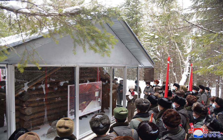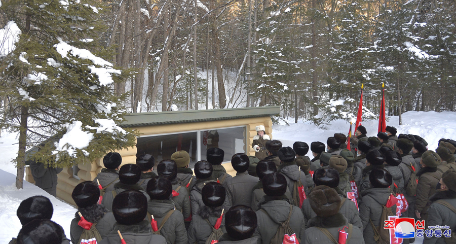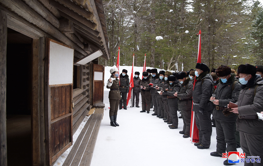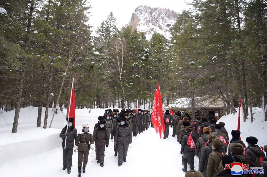 Samdžijon, 24. února čučche 109 (2020) (KCNA) – Poslanci Nejvyššího lidového shromáždění, kteří se účastní pochodu po místech revoluční a bojové slávy v oblasti hory Pektu (Pektusan), navštívili 24. února rodiště předsedy Kim Čong Ila v Pektusanském tajném táboře.