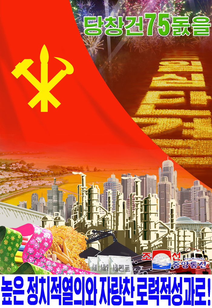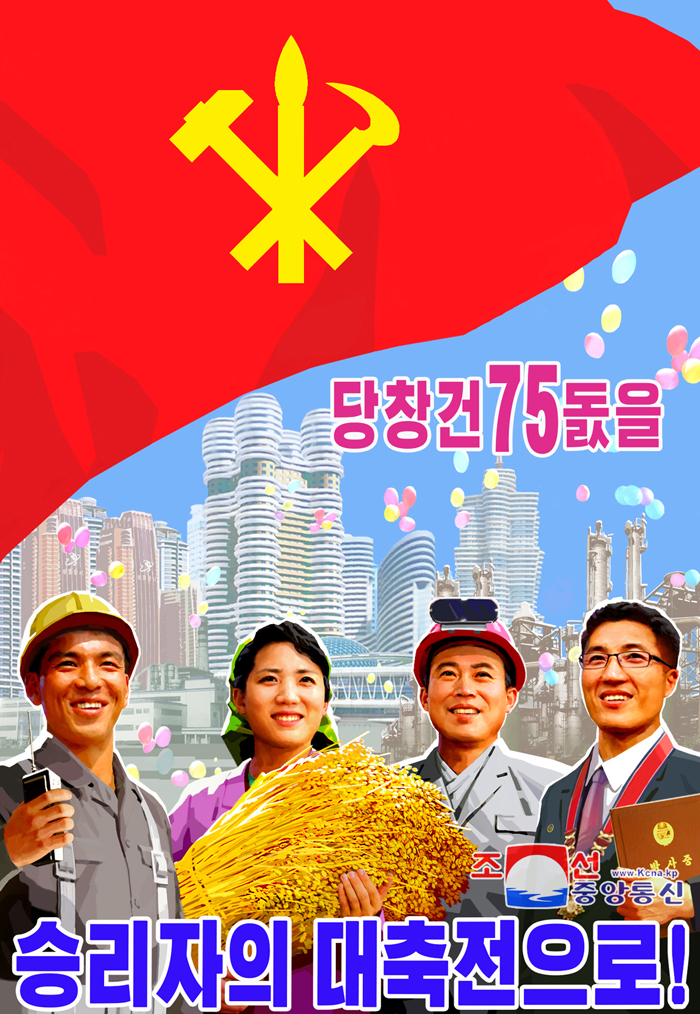 Plakáty „Oslavme 75. výročí založení Korejské strany práce s vysokým politickým nadšením a hrdými pracovními úspěchy!“, „Oslavme 75. výročí založení Korejské strany práce jako velkou slavnost vítězů!“ a jiné ztělesňují myšlenku, že je nezbytné oslavit významné říjnové výročí posílením jednomyslné jednoty a dosažením hrdých úspěchů při budování ekonomické moci a zlepšením životní úrovně lidu.