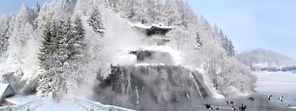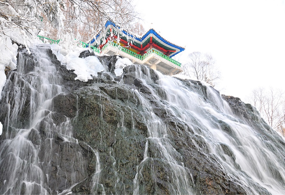 Křišťálově čistá voda se kaskádovitě padá po útesu, na kterém stojí pavilon, v nesčetném množství vodopádů teče po rozeklaných skalách, vytváří několik toků a znovu se spojuje a otevírá nádherný obraz v harmonii s jezerem na úpatí vodopádů.