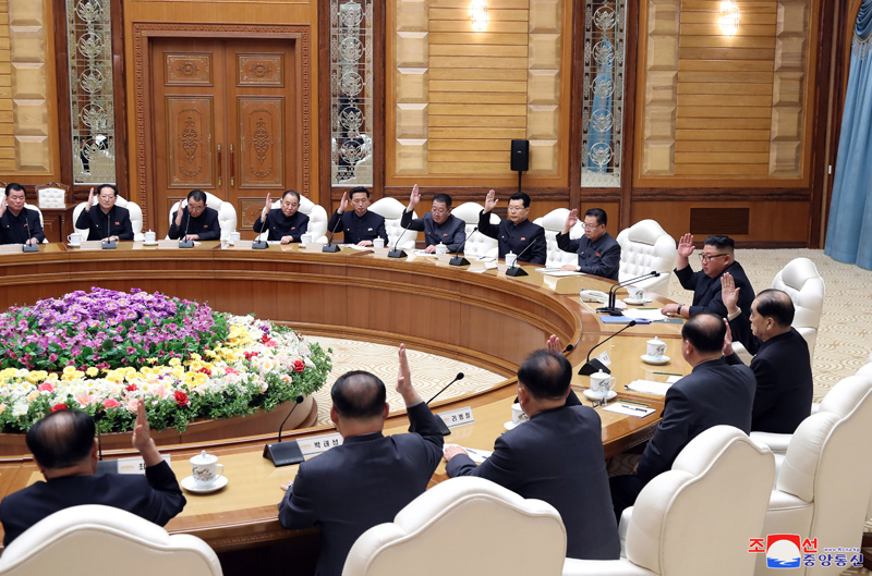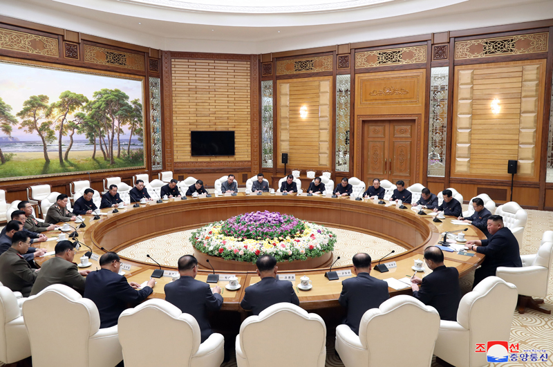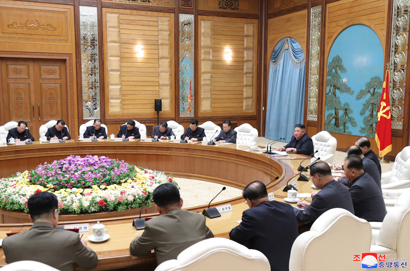 Po schválení politickým byrom ÚV Kórejskej strany práce predsedal zasadnutiu vážený najvyšší vodca strany, štátu a ozbrojených síl súdruh Kim Čong Un.