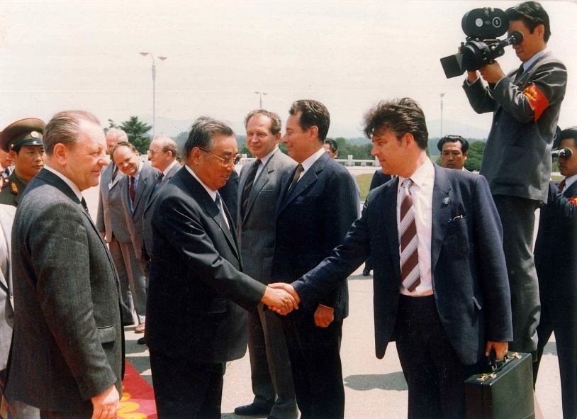 Generální tajemník Ústředního výboru Komunistické strany Československa RSDr. Miloš Jakeš (vlevo) přihlíží setkání pozdějšího předsedy a čestného předsedy Společnosti česko-korejského přátelství Pektusan RSDr. Jaroslava Kafky s velkým vůdcem soudruhem Kim Ir Senem v Pchjongjangu 27. 5. 1988