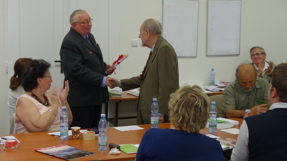 Předseda Společnosti česko-korejského přátelství Pektusan soudruh Jozef Servista předává čestné uznání soudruhu Miloši Jakešovi na 17. plénu 8. 6. 2019