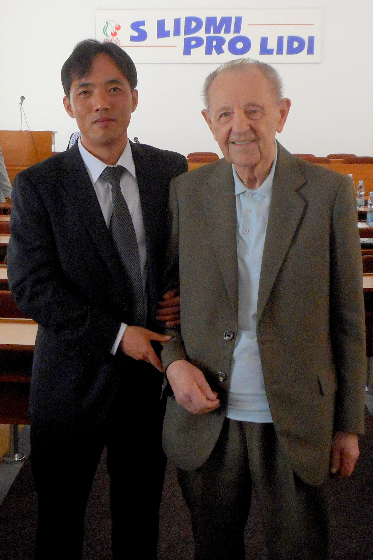Súdruh Miloš Jakeš s vtedajším III. tajomníkom veľvyslanectva KĽDR súdruhom Ma Čchol Chunom v roku 2016
