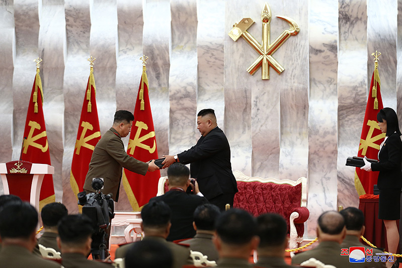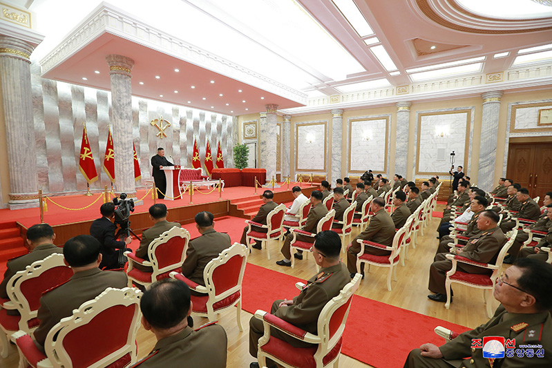 Velící důstojníci, poctění obdržením pamětních pistolí přímo od váženého soudruha nejvyššího vůdce, přísahali věrnost soudruhu Kim Čong Unovi a Ústřednímu výboru strany, držíce zbraně revoluce, se kterou sdílejí osud na tvrdé cestě rozhodujících bitev.