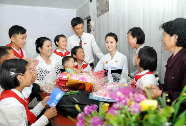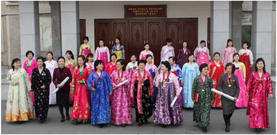 Vážený nejvyšší vůdce soudruh Kim Čong Un, který zdědil myšlenku a zámysl velkého vůdce a velkého generála, moudře vede ženy k tomu, aby plně vykonávaly svou úlohu květů éry, plníce svou povinnost ve zvyšování bohatství a moci vlasti, harmonie a štěstí společnosti a rodiny.