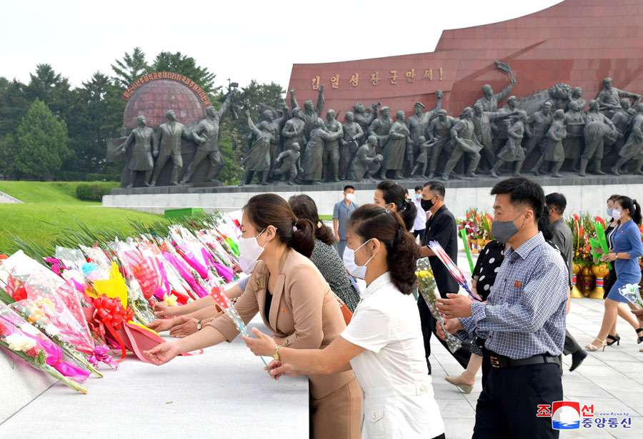 K bronzovým sochám a portrétům slunečně usměvavého vůdce a generála v různých částech hlavního města, mimo jiné na Kim Ir Senově univerzitě, Ministerstvu lidových ozbrojených sil a v Uměleckém studiu Mansude, byly položeny koše a kytice květin jménem Korejské lidové armády, Sil veřejné bezpečnosti, institucí a podniků.