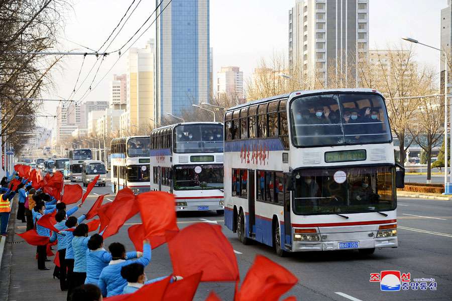 Atmosféru jejich uvítání pozvedl příjezd autobusů s bojovníky divizí členů strany z hlavního města na ulici Rjomjong poblíž Paláce slunce Kumsusan – nejvyšší svatyně čučche.