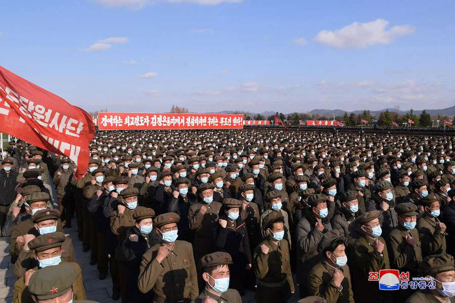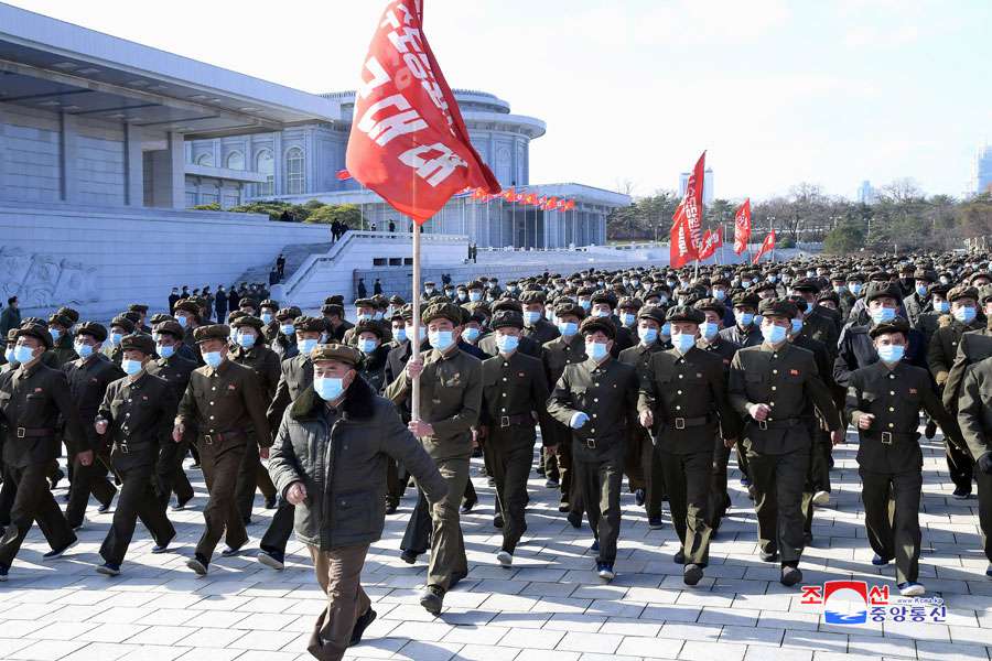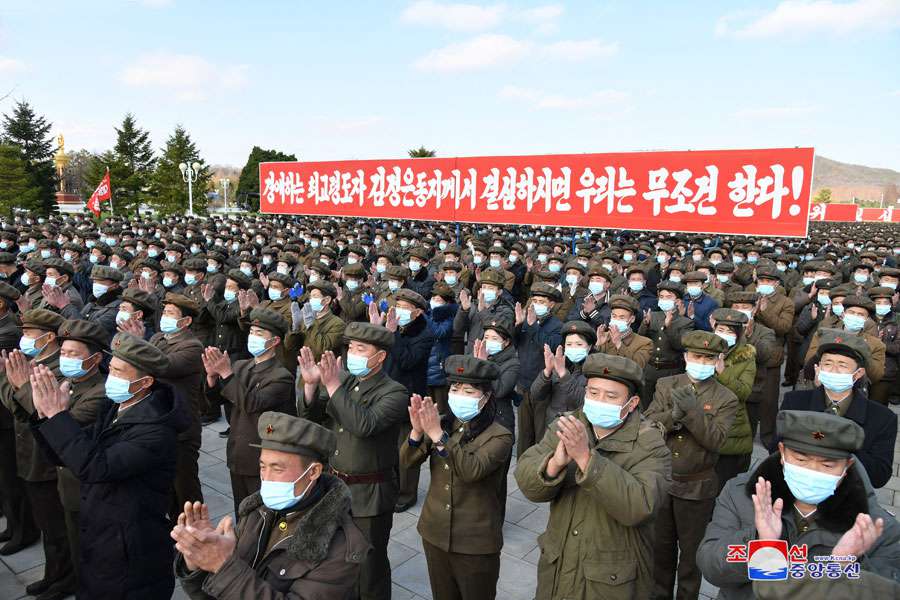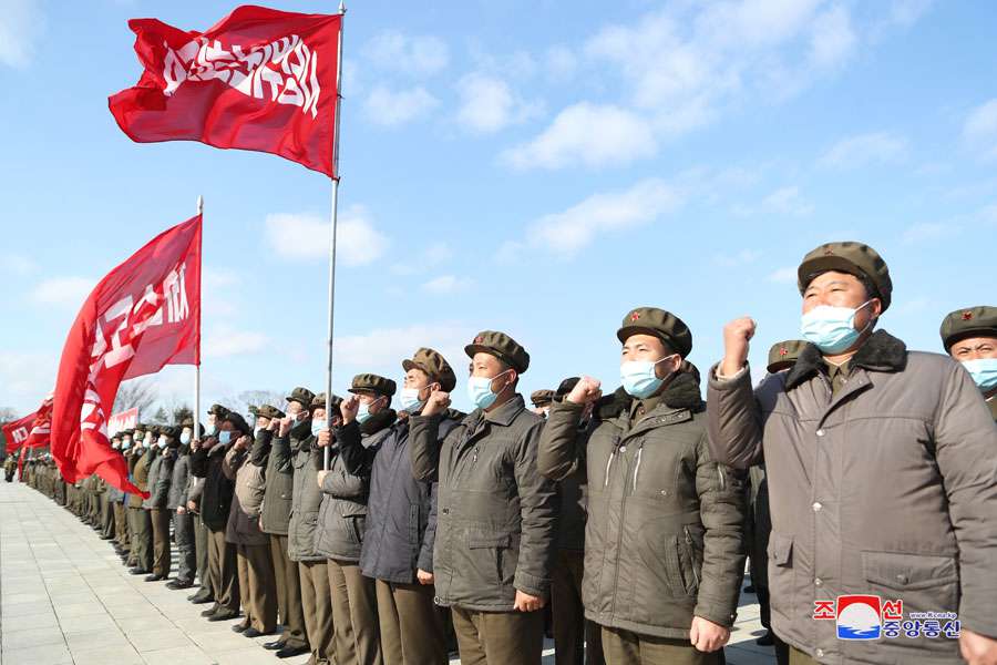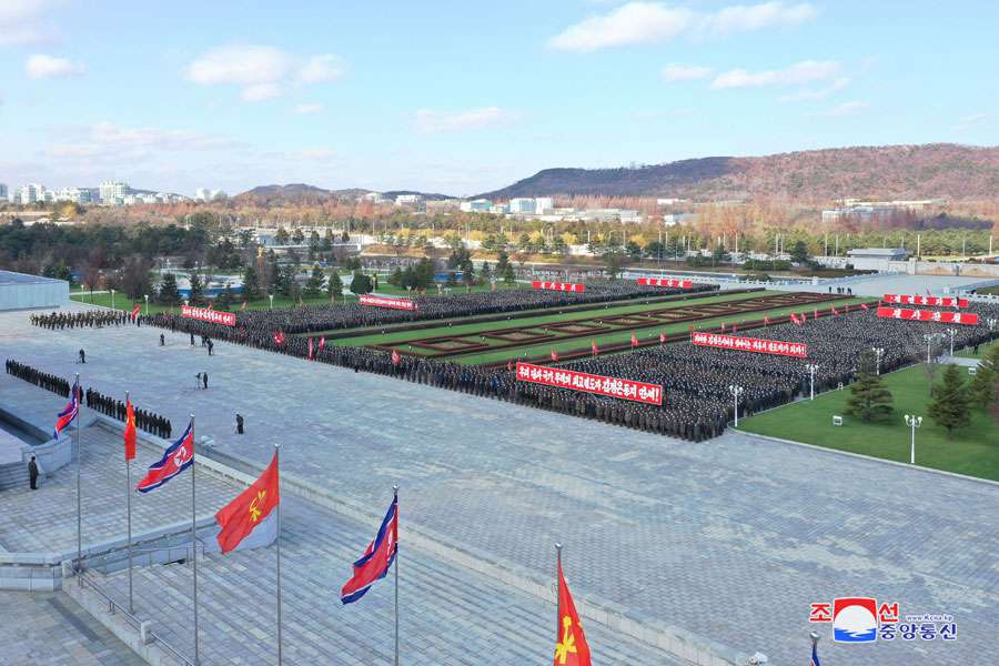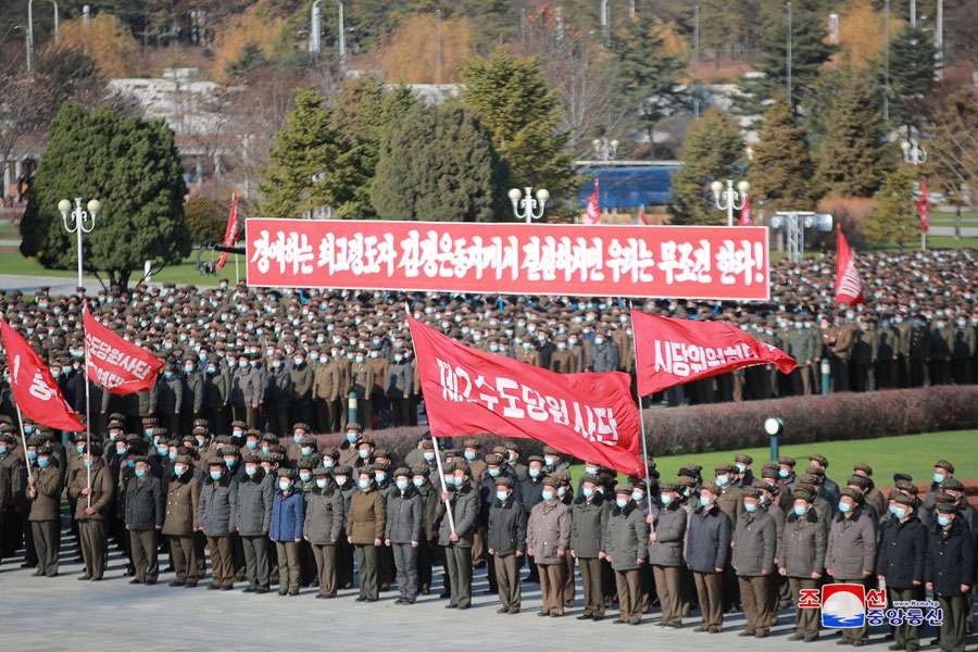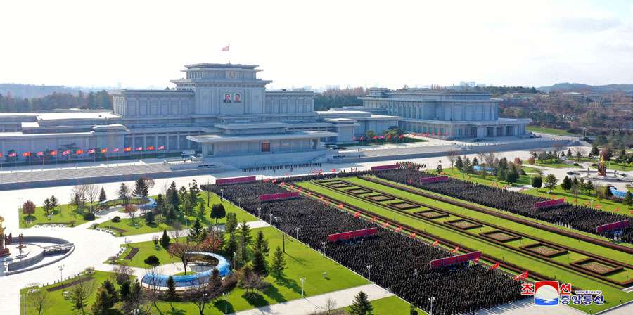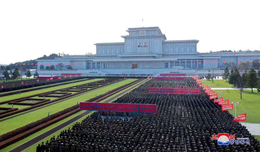 Na nádvoří Paláce slunce Kumsusan – nejvyšší svatyně čučche – se konalo shromáždění bojovníků divizí členů strany z hlavního města k předložení zprávy o věrnosti velkému vůdci soudruhu Kim Ir Senovi a velkému vůdci soudruhu Kim Čong Ilovi.
